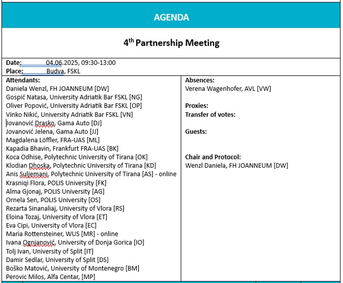 In the context of the implementation of the project entitled “International Engineering Competence Centers to push Sustainable Mobility Development in Albania and Montenegro – INTEC (project number: 101081873)” with the main partner University of Applied Sciences FH Joanneum (FHJ) – Graz, Austria, on 4th June 2025, the 4th Partnership Meeting took place. The meeting location was at partner FSKL in Budva. 23 people in total participated from the partners.