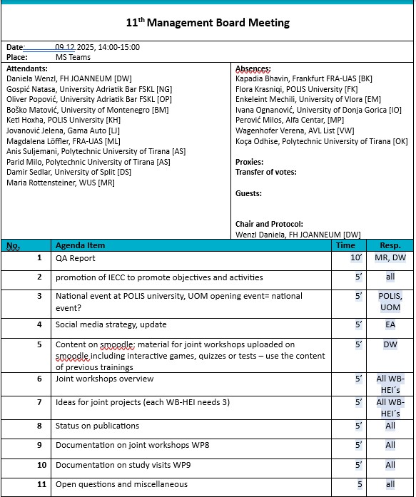 On 09 Jdecember 2026, the 11th Management Board Meeting of the INTEC Project (“International Engineering Competence Centers to push Sustainable Mobility Development in Albania and Montenegro” – #101081873) took place online, with 11 participants from partner institutions.