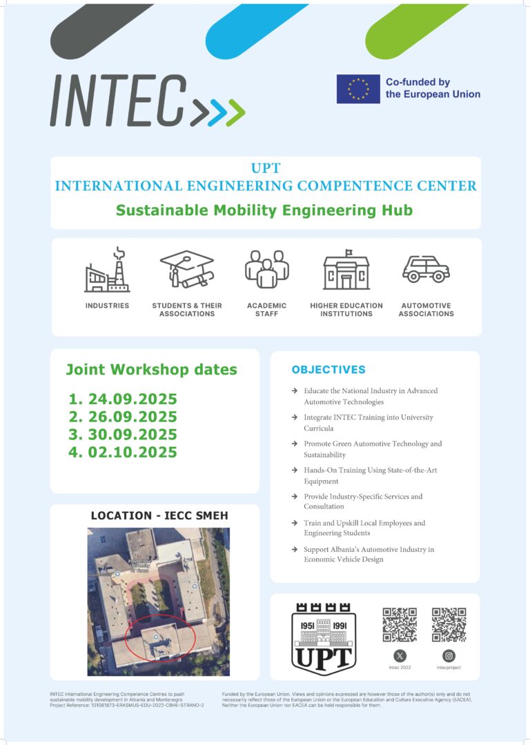 The Polytechnic University of Tirana (PUT) will establish a training center called „Sustainable Mobility Engineering Hub“ (SMEH), which will position itself as a driving force in green transportation, sustainable mobility, future technologies to reduce energy consumption and emissions. Through advanced trainings and innovation, the SMEH will contribute to Albania’s alignment with European Union directives and global sustainability goals. We will offer trainings to students and stakeholders and will prepare them for the future needs on the job market. The trainings in the IECC´s will also be integrated in the curriculum of the mechanical engineering department to guarantee sustainability.